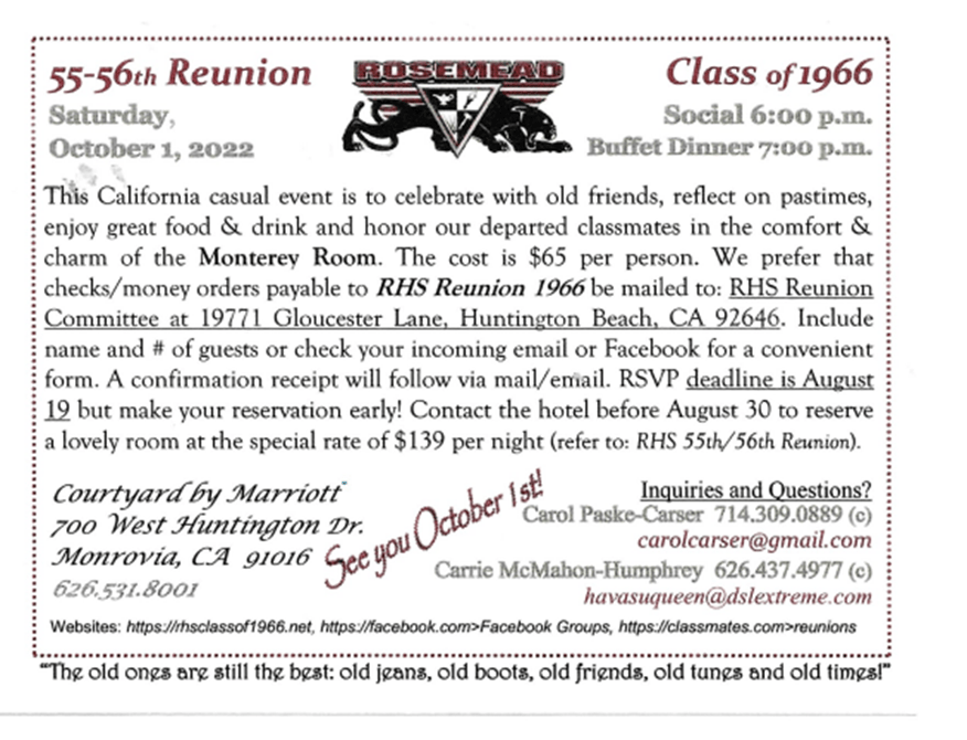 55-Year Reunion Update from Carol Carser June 3, 2022 Featured ~ Marie Alvarado Share this: Share on X (Opens in new window) X Share on Facebook (Opens in new window) Facebook Like Loading... Related Published by Marie Alvarado View all posts by Marie Alvarado