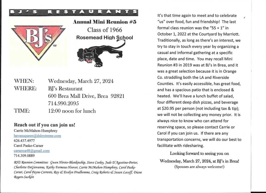 Thanks to Carol and Carrie and the entire Reunion Committee for arranging this event providing us with another opportunity to gather for an afternoon of sharing time and memories with wonderful friends.